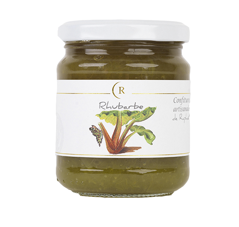 Rhubarbe 64% ,sucre, Orange, gélifiant : farine de graine de caroube et carraghénanes (algues). Préparée avec 64g de fruits pour 100g. Teneur totale en sucre 55%.
